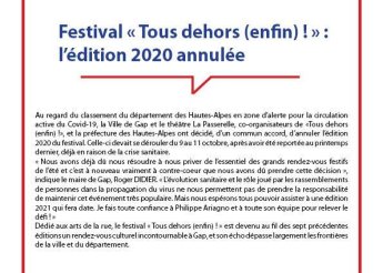 Lire la suite de Hautes-Alpes : l'édition 2020 du festival "Tous dehors (enfin !)" finalement annulée LoisirsHautes-Alpes : l'édition 2020 du festival "Tous dehors (enfin !)" finalement annuléeLa mairie de Gap annonce ce jeudi que l'édition 2020 du festival "Tous dehors (enfin !)" qui devait se tenir du 9 au 11...Tous rentrés