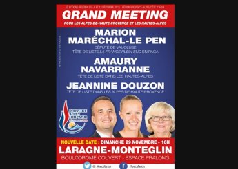 Lire la suite de Régionales PACA : Le meeting du FN dans les Alpes du Sud aura finalement lieu le 29 novembre à Laragne PolitiqueRégionales PACA : Le meeting du FN dans les Alpes du Sud aura finalement lieu le 29 novembre à LaragneRégionales PACA : Après l'annulation du meeting prévu dimanche dernier à Laragne, en raison des attentats de Paris et...régionales Paca