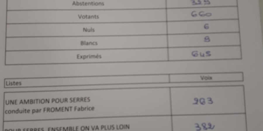 Publié par Jean Eymar le dim, 03/10/2021 - 21:57 Élections municipales de serres ce dimanche La liste du maire sortant Fabrice Froment a été battue par la liste de Daniel Rouit (59 % des suffrages)