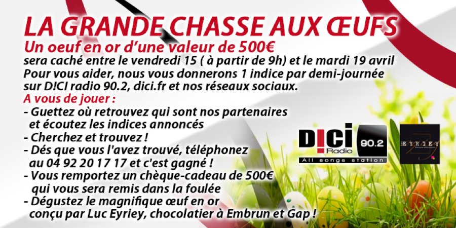 Comme chaque année, jouez à la grande chasse aux œufs D!CI ! Un œuf en or d'une valeur de 500€ sera caché à partir du vendredi 15 avril 9h et jusqu'à ce qu'il soit trouvé chez l'un de nos annonceurs des Alpes du Sud! Pour vous aider nous donnerons un indice par demi-journée sur D!CI TV, D!CI Radio et dici.fr et nos réseaux sociaux.